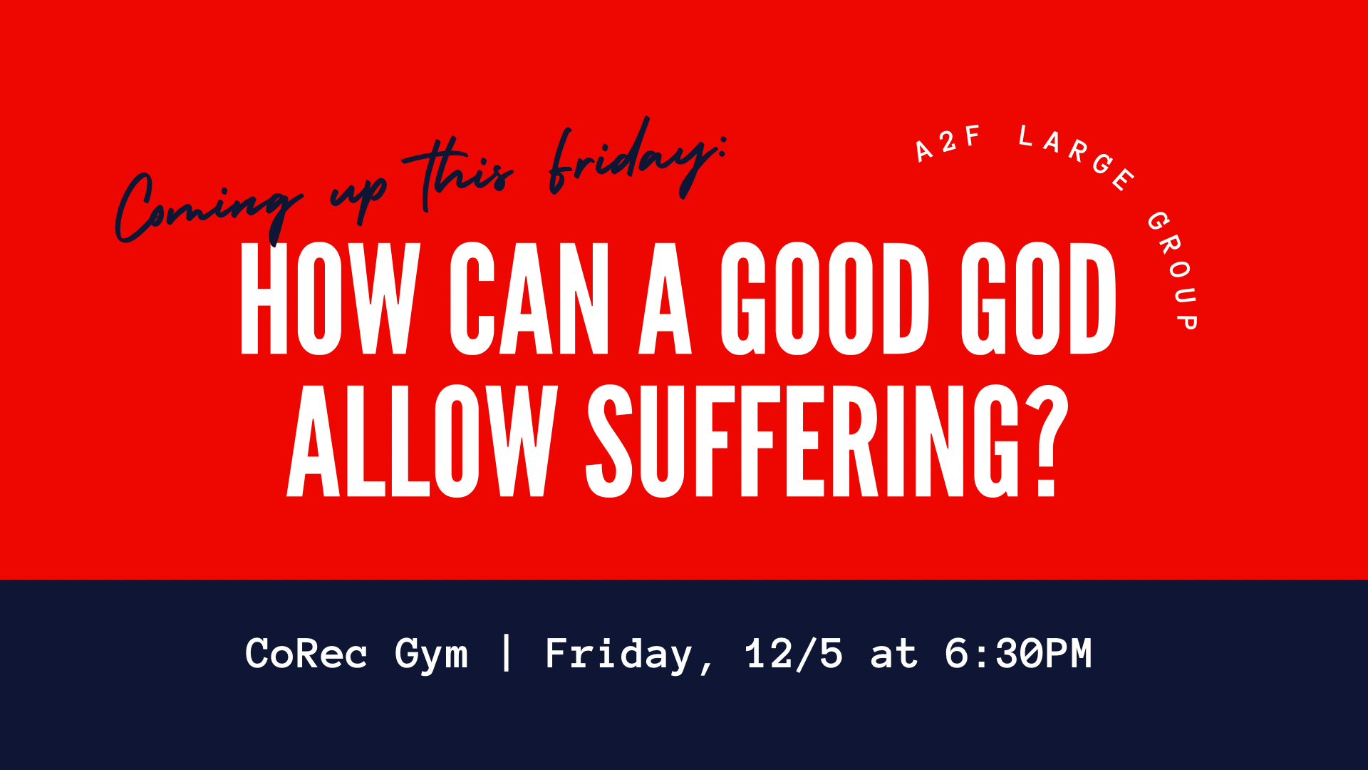 on that note, reminder that we have a special a2f friday this week. corec. 6:30p. starting with dinner and then our special talk (how can a good god allow suffering) told from the unique perspective of one our mentors who was considering becoming a buddhist monk early on in his life (brandon). afterwards, we’ll end the night with some roller-skating at great indoor skates, lafayette.
